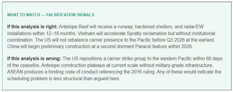 The deeper question — the one the Chaos Map framework makes legible but does not answer — is whether Antelope Reef is a local play or a systemic one. If local, it is an enhancement of the Paracel network: another runway, another radar array, another coast guard berth. Significant but containable. If systemic, it is a node in a forward-positioned architecture optimised for a Taiwan contingency, 162 nautical miles from Sanya, capable of hosting the surveillance, electronic warfare, and A2/AD assets that would complicate any US intervention in the Taiwan Strait. AMTI’s analysis leans toward the latter. So does the geometry. A reef shaped with an 11,000-foot straight edge facing the open sea is not a coast guard station. It is a denial platform.