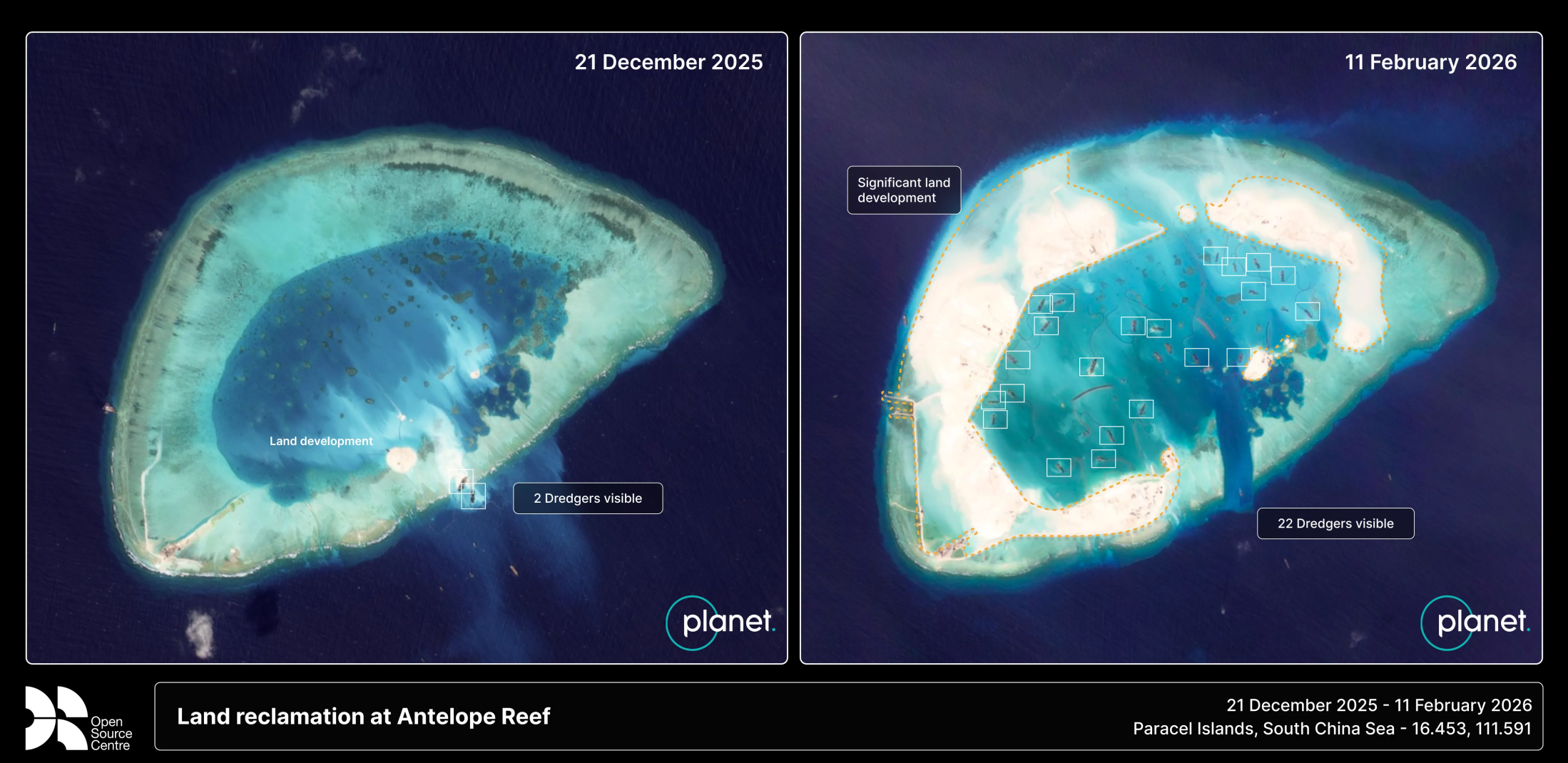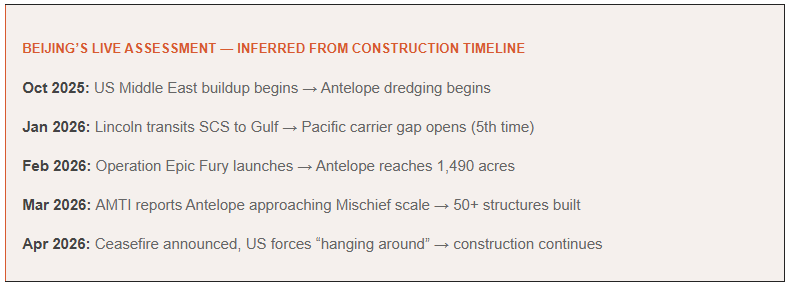 The conventional read — and it is not wrong, just insufficient — is that Beijing exploited a distraction. The US was looking at Tehran; China built an island. There is something to this. The CSIS Asia Maritime Transparency Initiative noted that Antelope Reef represents the first significant artificial island-building China has undertaken in the South China Sea since 2017. The pause lasted seven years. It broke the moment American attention went elsewhere. That is not a coincidence. But it is also not the whole picture.