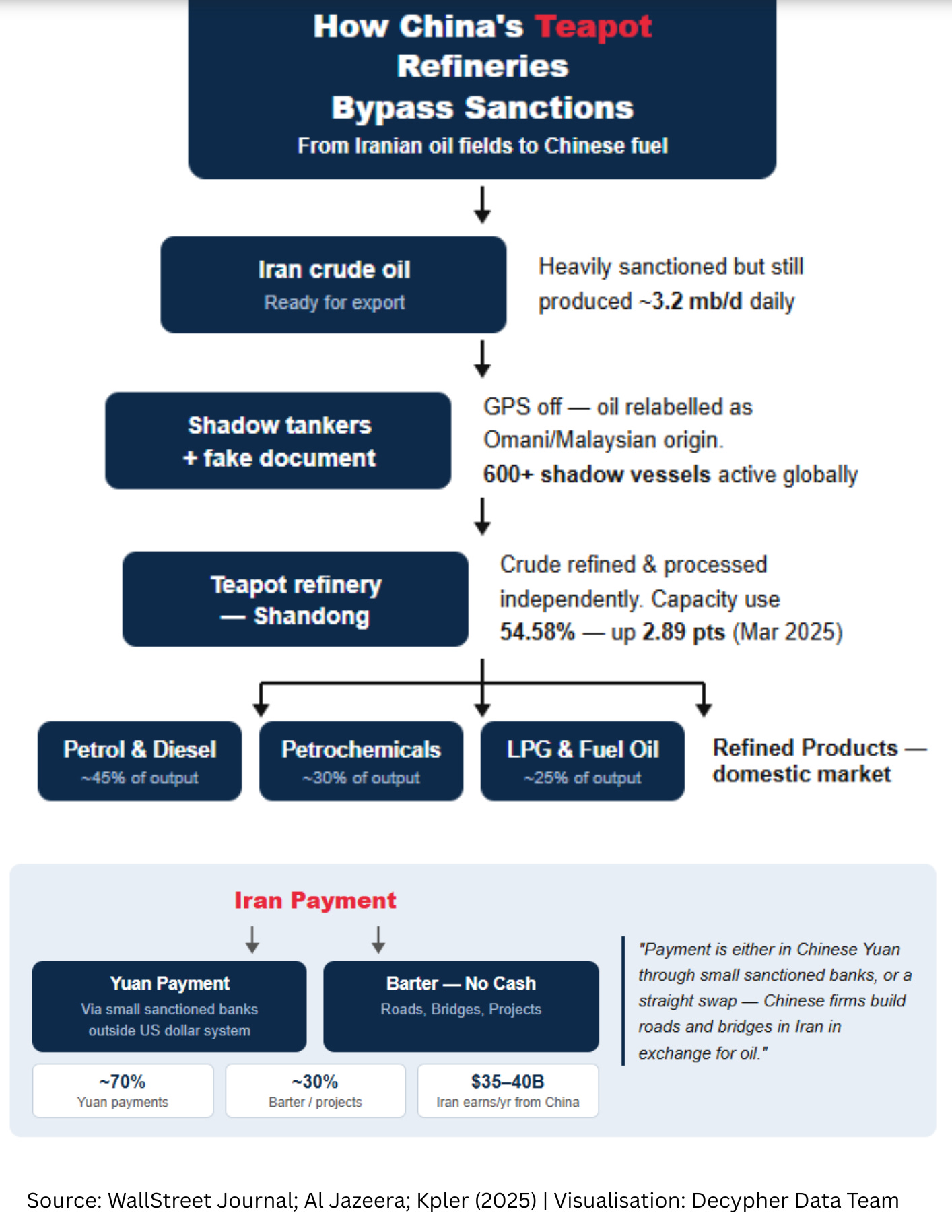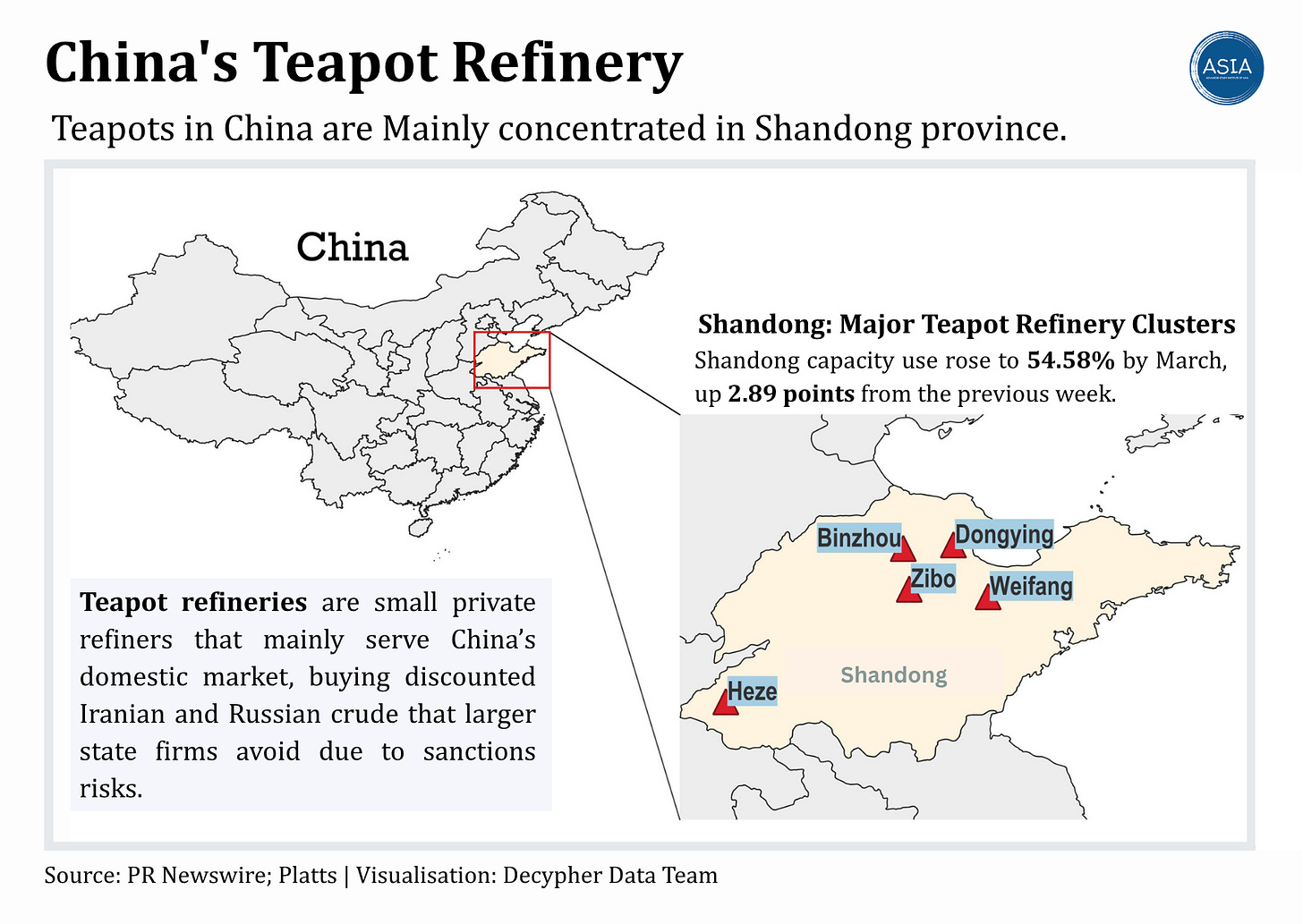 The engine behind this shift is a network of small, privately-run Chinese refineries — known as "teapots" — that mainly serve China's domestic market, buying discounted Iranian and Russian crude that larger state firms avoid due to sanctions risks.