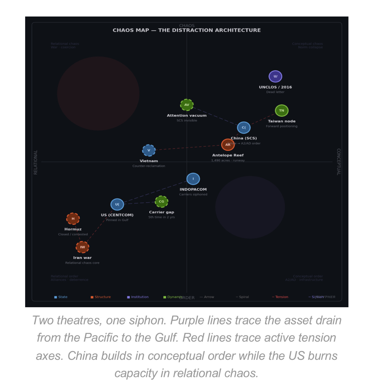 Plot this on the Chaos Map — the framework for locating actors between order and chaos, relational and conceptual pattern-making — and the architecture becomes visible. The Iran war sits deep in relational chaos: kinetic, volatile, consuming. It is a gravity well. Everything near it — US assets, attention, political bandwidth — gets pulled in. China, by contrast, operates in the opposite quadrant: conceptual order. Methodical. Institutional. Arrow-motion. Antelope Reef is not a provocation. It is infrastructure for a thesis about what comes after the American security guarantee in Asia proves itself unable to hold two theatres at once.