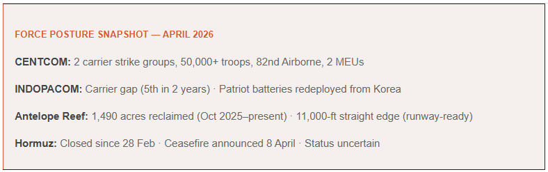 This is the part that matters for the next decade of Asian security. Operation Epic Fury gave Beijing something it could not have obtained any other way: a live, high-definition assessment of American force-projection capacity under stress. Not a wargame. Not a think-tank simulation. An actual war, with actual redeployments, actual logistics chains, actual political constraints. The results are legible from satellite imagery alone. The US committed two carrier strike groups, 50,000 troops, the largest air force deployment since Iraq 2003, ground forces from the 82nd Airborne, two Marine Expeditionary Units — and still needed an extension to compel Iran to discuss reopening the Strait of Hormuz. Hegseth confirmed yesterday that American forces will be “hanging around” the Middle East through the ceasefire and beyond.
