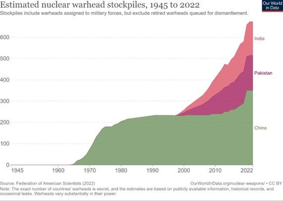 Estimated nuclear warhead stockpiles, 1945 to 2022. Stockpiles include warheads assigned to military forces, but exclude retired warheads queued for dismantlement.