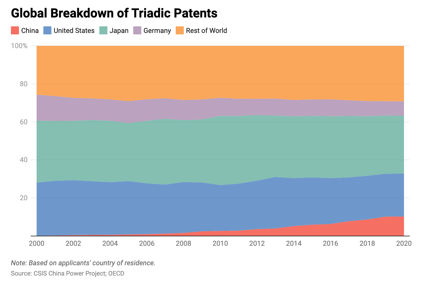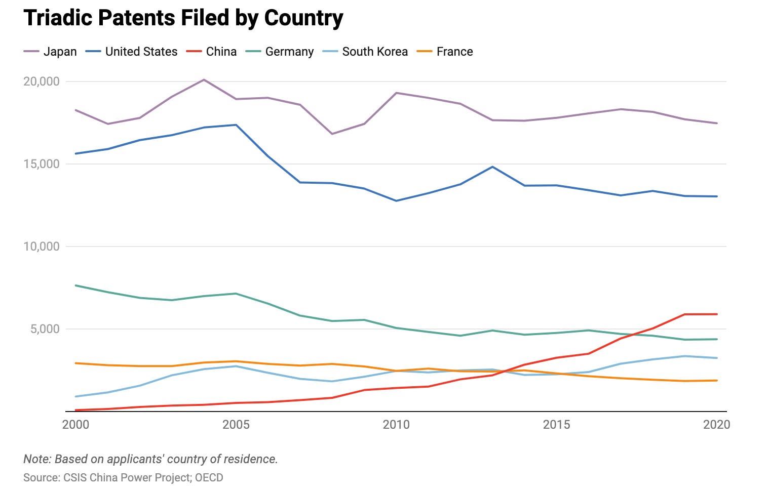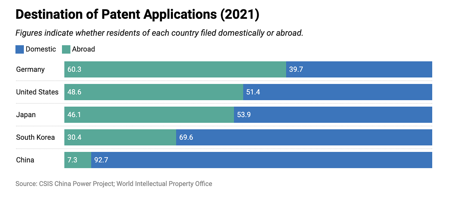 While China processes the greatest number of domestic patent applications annually, it lags behind the United States and Japan with respect to triadic patents. According to the OECD, in 2020, China had only 5,897 triadic patents compared to 13,040 for the United States and 17,469 for Japan. This disparity is due to Chinese residents filing mostly domestically. In 2021, Chinese patent seekers filed 92.7 per cent of their patent applications domestically through the CNIPA, and only 7.3 per cent filed abroad. This suggests that many of these patents do not meet the more stringent requirements of the international patent system.