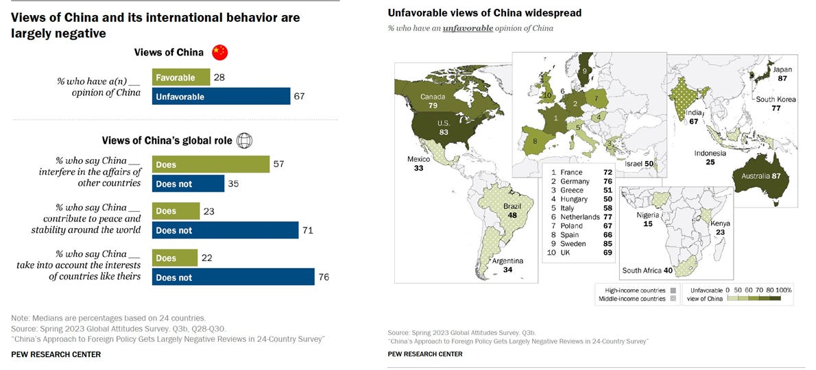 Views of China are largely negative in 24 countries where Pew Research Center conducted a survey in the first half of 2023. A median of 67% people have a negative view of China, compared to just 28% who harbor a favorable view of China. Negative views of China extend to the Chinese isolation in international politics. Even though the Chinese state has contributed to brokering a peace deal between Saudi Arabia and Iran. Issuing a 12 point plan for ending the Ukraine war. A median of 71% people do not see China as a participant in International fora. People also tend to view China as not abiding by the interests of those countries it directly interacts with. For a country that sees itself as the next power these are worrying signs.