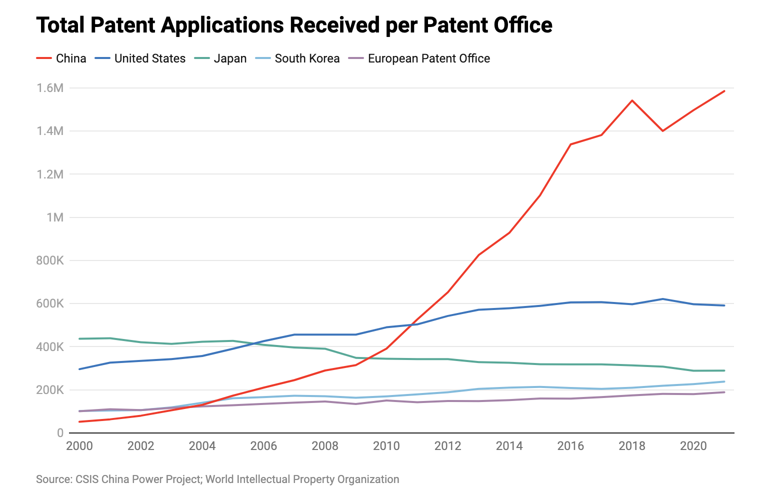 China has made significant progress in filings through the Patent Cooperation Treaty (PCT), increasing from 782 in 2000 to 70,015 in 2022 according to CNIPA. China has been the global leader in PCT application volume since 2019 when it surpassed the United States. However, it is important to note that PCT applications only provide a license to file a patent application in another country and do not necessarily mean that an overseas patent has been acquired.