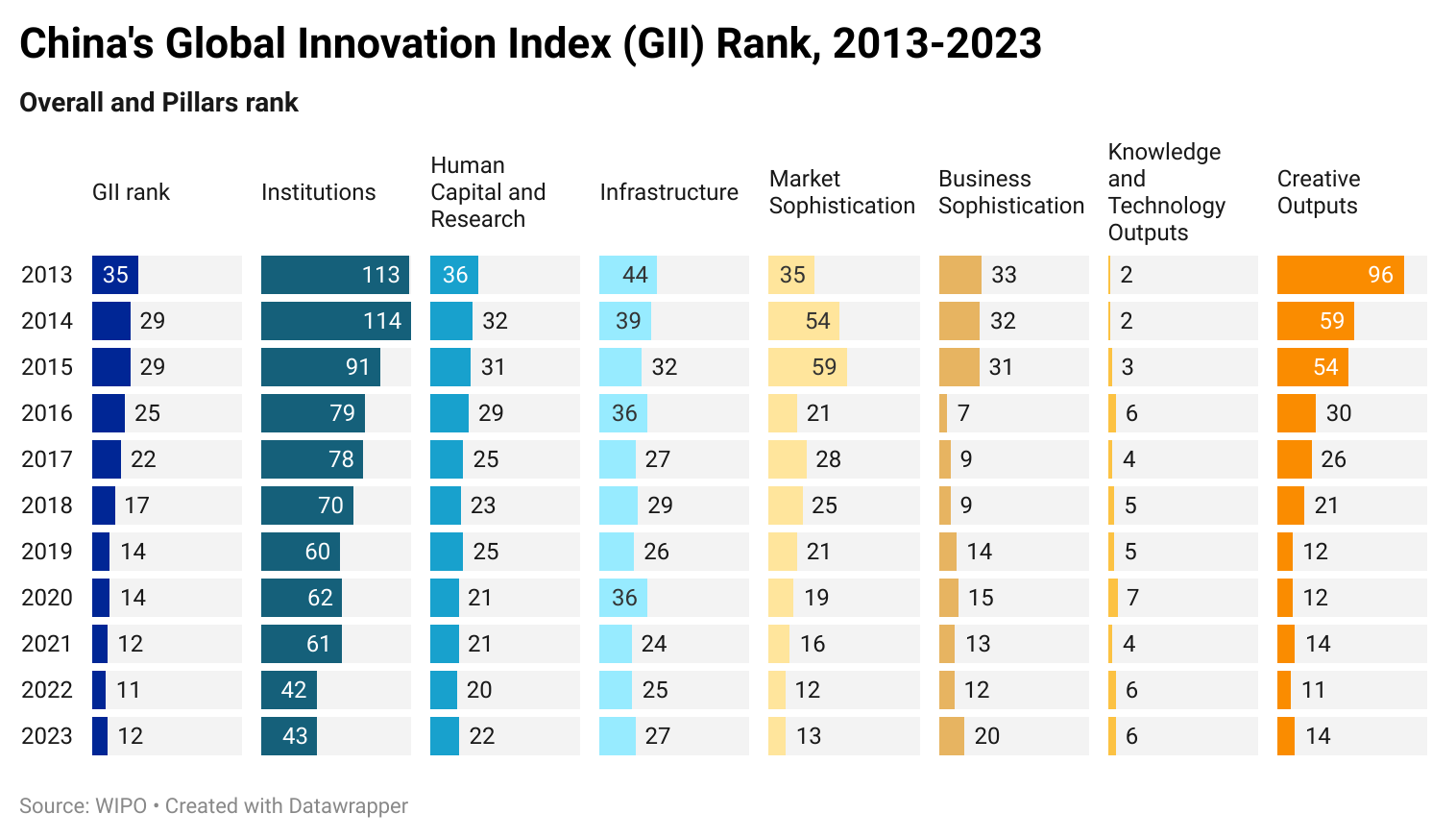 China has made remarkable progress in innovation, moving from the 35th position in 2013 to 12th in the Global Innovation Index, 2023 world rankings. It has been one of the top climbers of the decade. Despite dropping one rank from last year, China remains the only middle-income economy in the top 30 innovative countries worldwide. Also, the country retained 3rd place in the South East Asia Oceania region and the top spot in the upper middle-income group.