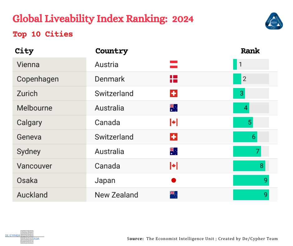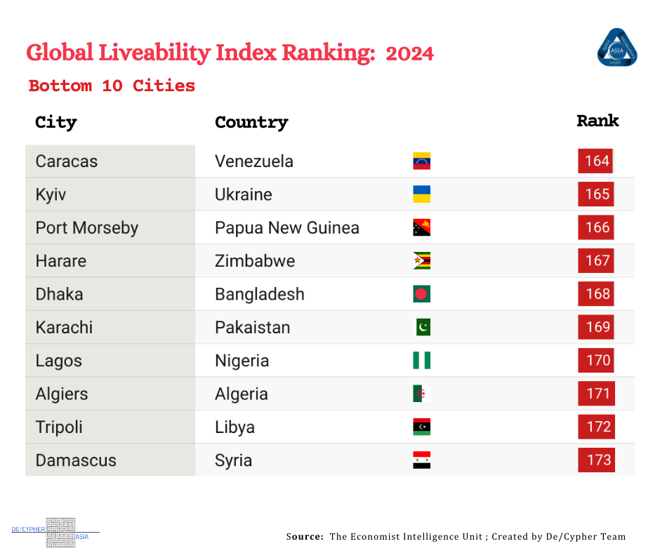 Vienna, Copenhagen, Zurich, Melbourne, and Calgary were ranked at the top while the five least liveable cities in the list were Damascus, Tripoli, Algiers, Lagos, and Karachi.