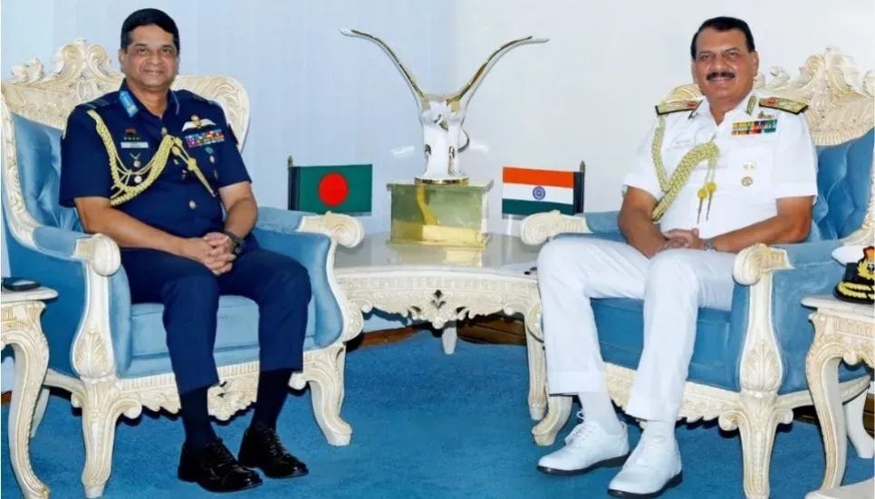 The Financial Express reports that Indian Navy Chief Admiral Dinesh K Tripathi met with Bangladesh Air Force Chief Air Marshal Hasan Mahmood Khan at the BAF Headquarters. They discussed bilateral issues of mutual interest. Admiral Tripathi, accompanied by his spouse and delegation, arrived in Bangladesh on June 30 for an official visit. This visit aims to enhance cooperation and strengthen the friendly relationship between the two countries.