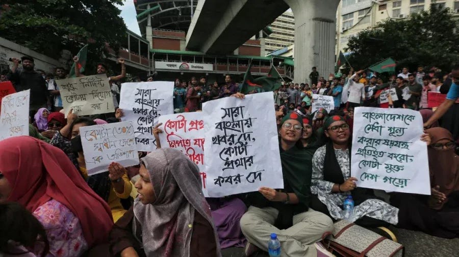 Tausiful Islam writes in the Daily Observer that Dhaka University students defied barricades set up by Bangladesh Chhatra League (BCL) to block the Shahbagh Intersection for the third consecutive day, demanding the abolition of the quota system in government jobs. The protest caused severe traffic jams for over six hours. Despite BCL leaders' attempts to obstruct them, the students continued their rally, chanting slogans and singing patriotic songs.