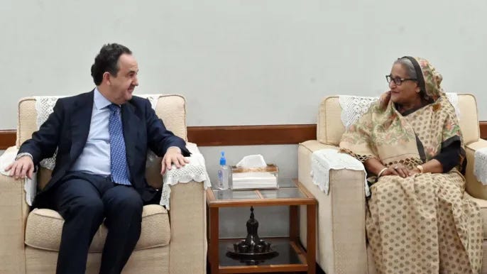 The Business Standard reports that Prime Minister Sheikh Hasina emphasized the need to boost trade and investment between Bangladesh and Spain during a meeting with Spanish Ambassador Gabriel Maria Sistiaga Ochoa de Chinchetru on 4 July 2024. Hasina encouraged increased Spanish investment, particularly in Bangladesh's new economic zones, and sought Spanish support post-LDC graduation. The ambassador praised Bangladesh's budget, highlighting its focus on education and social safety nets, and noted ongoing negotiations for a bilateral partnership agreement.
