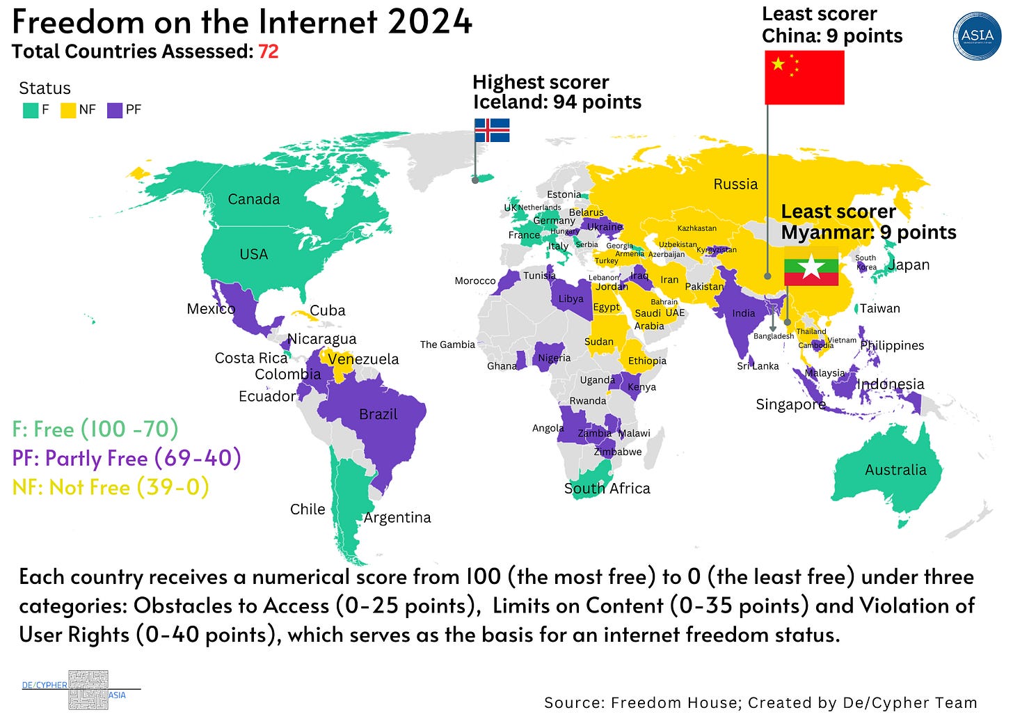 Iceland has been ranked as the leading country in terms of Internet freedom (2024), receiving an impressive 94 points out of 100. China and Myanmar have the lowest scores, with 9 points each.