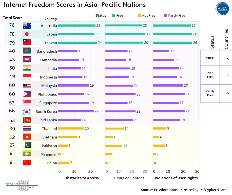 Freedom on the Net, 2024: The Freedom House's internet freedom report seeks to provide a comprehensive analysis of the state of internet freedom in various countries, with a focus on key indicators such as obstacles to access, limits on content and violation of user rights. Each country is ranked on a scale of 0 to 100, with 100 representing the most free conditions and 0 the least free.