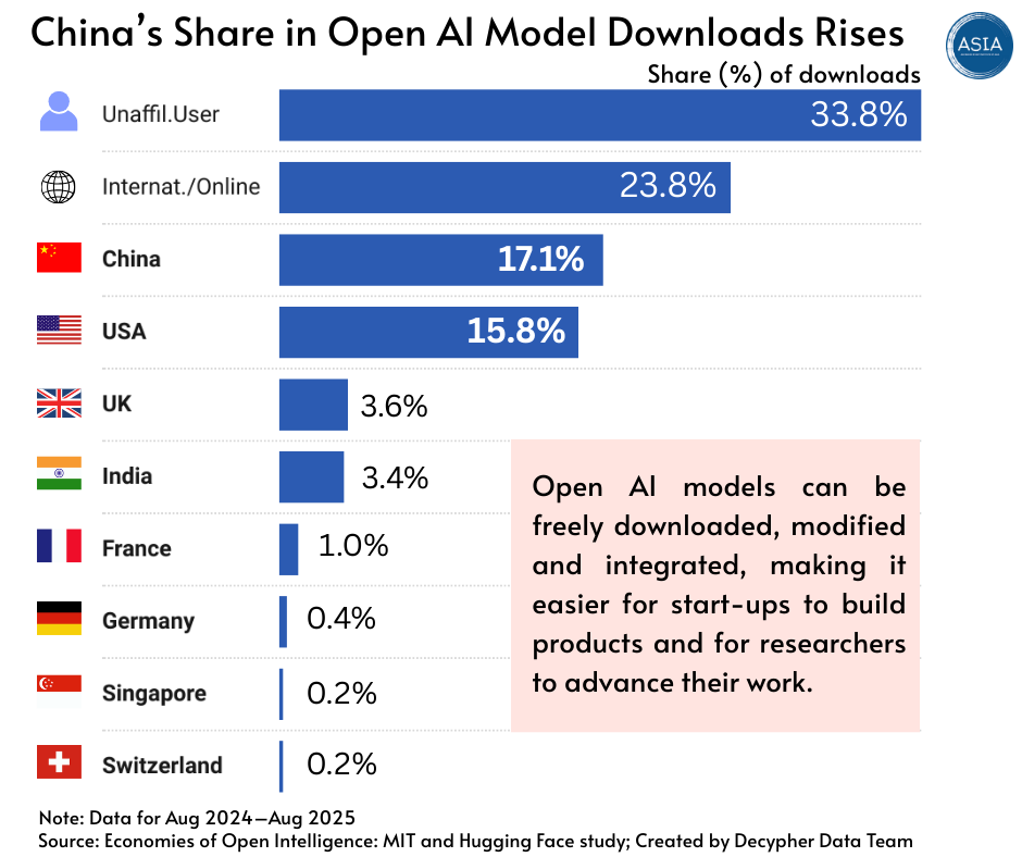 A study by the Massachusetts Institute of Technology and open-source AI start-up Hugging Face found that Chinese open-source AI models captured 17.1% of global downloads between August 2024 and August 2025, surpassing the US share of 15.8% for the first time. The surge is driven largely by DeepSeek and Alibaba’s Qwen models.