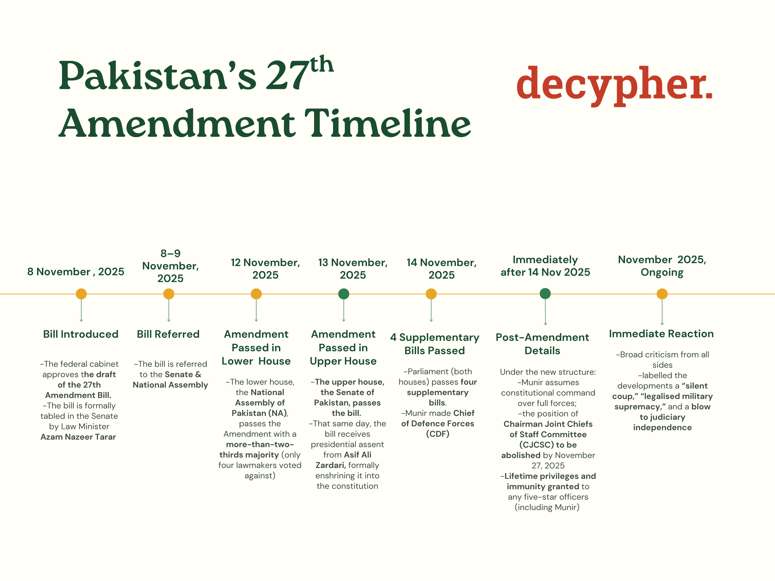 With a history of military takeovers, Pakistan’s most recent power grab has been carried out without a single tank on the streets. The recent amendment passed in the country is a clear indication of a structural break in the political evolution of Pakistan. General Asim Munir now occupies the apex of power in the state – a move done through legal measures and not force. The weaponisation of the constitution by the Pakistan Army will weaken the democratic foundations of the country.