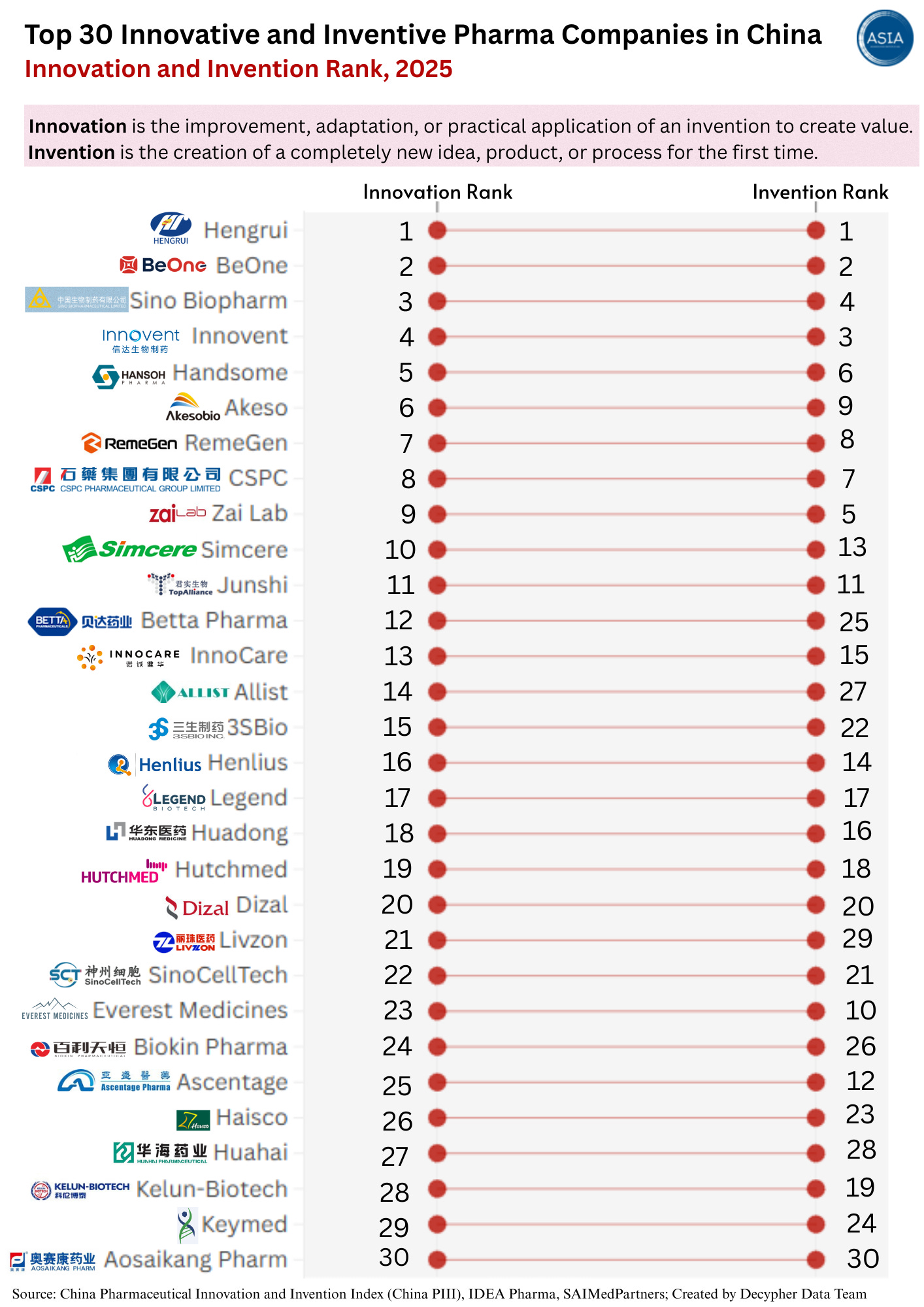 In the 2025 China Pharmaceutical Innovation and Invention Index, Hengrui leads both the Innovation and Invention rankings, underscoring its position as the country’s most balanced and research-driven pharma company. Everest Medicines stands out as a rising force in China’s biopharmaceutical landscape, ranking 10th in invention and 23rd in innovation. The top 30 Chinese companies obtained 24 innovative drug approvals in 2024, with biologics accounting for half.