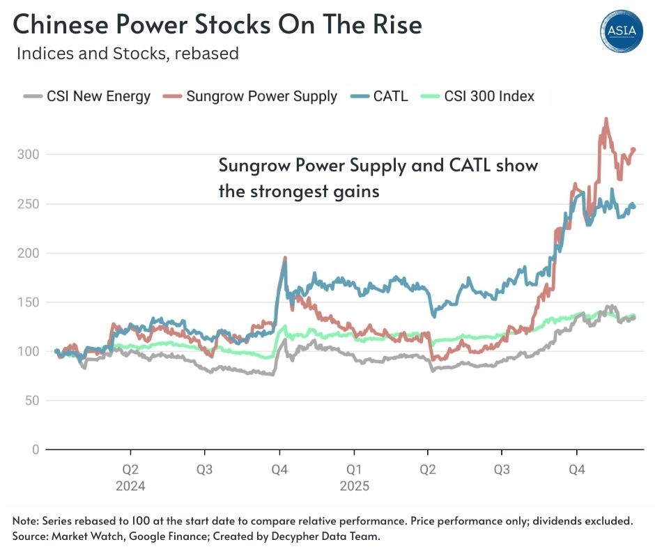 Shares of Chinese battery and power-equipment makers have surged this year, driven by rising demand from energy-intensive data centres and the global build-out of artificial intelligence. The Financial Times, reports that CATL’s shares are up about 45 per cent this year, while Sungrow Power Supply has gained roughly 130 per cent. The CSI New Energy index has risen around 38 per cent in 2025.