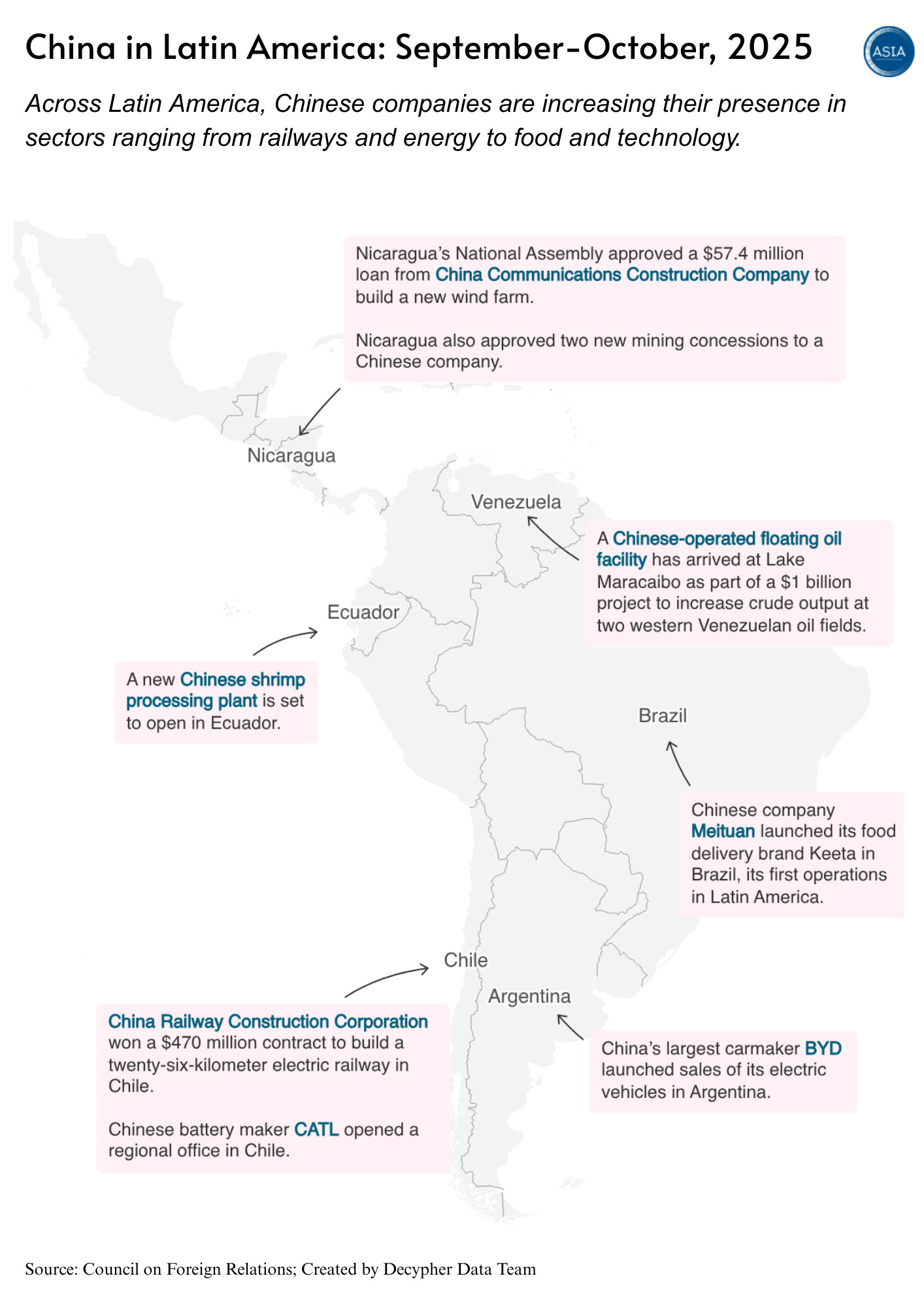 Beyond trade, Chinese companies have expanded their physical presence across Latin America. Recent projects include infrastructure development in Chile, renewable energy investments in Nicaragua, oil facilities in Venezuela, and manufacturing expansion in Ecuador. Chinese firms have also entered consumer markets in Brazil and Argentina.