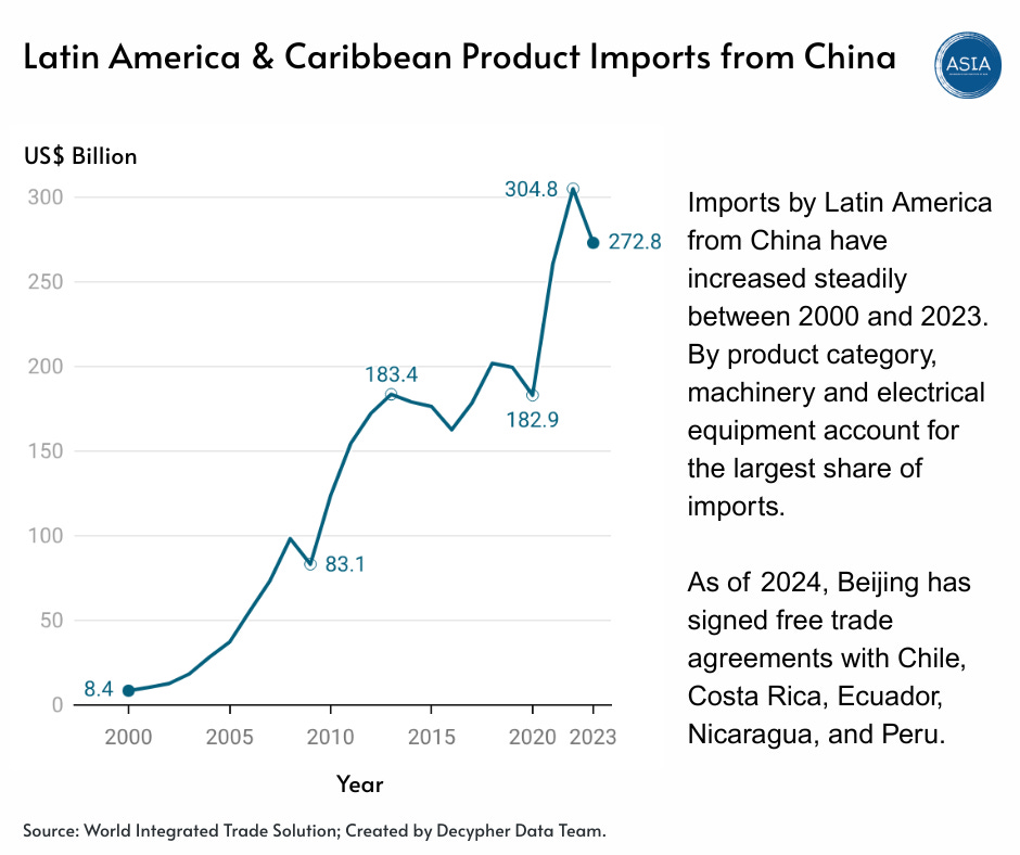 Latin America’s product imports from China have increased steadily between 2000 and 2023, rising from just $8.4 billion to over $270 billion. Machinery and electrical equipment dominate import categories, reflecting the region’s growing dependence on Chinese industrial goods.
