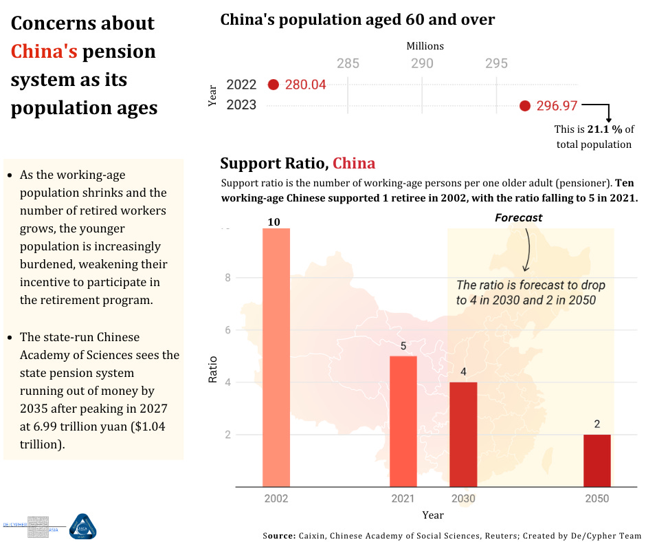 Approximately one-third of China's provincial-level jurisdictions are running pension deficits. The state-run Chinese Academy of Sciences estimates that the state pension system will run out of money by 2035.