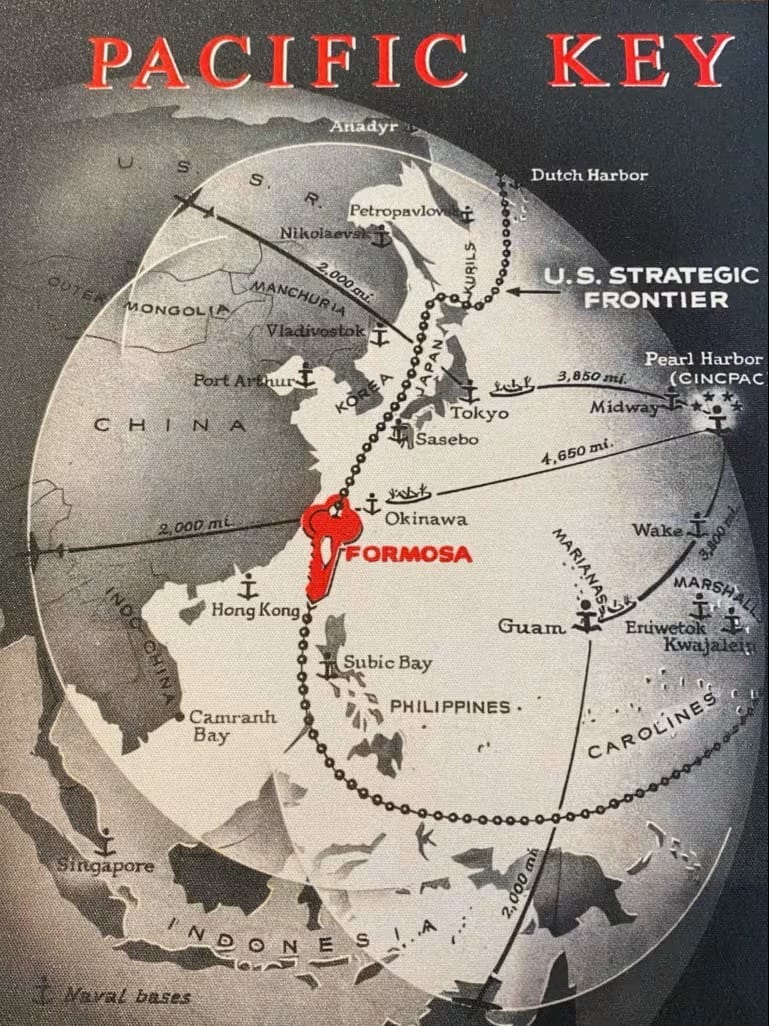The map, with Taiwan at its center, is headlined "Pacific Key." It appeared in 1950 in Time, the once-venerable U.S. magazine, and clearly depicts the East Asia strategy the U.S. was pursuing almost 75 years ago.