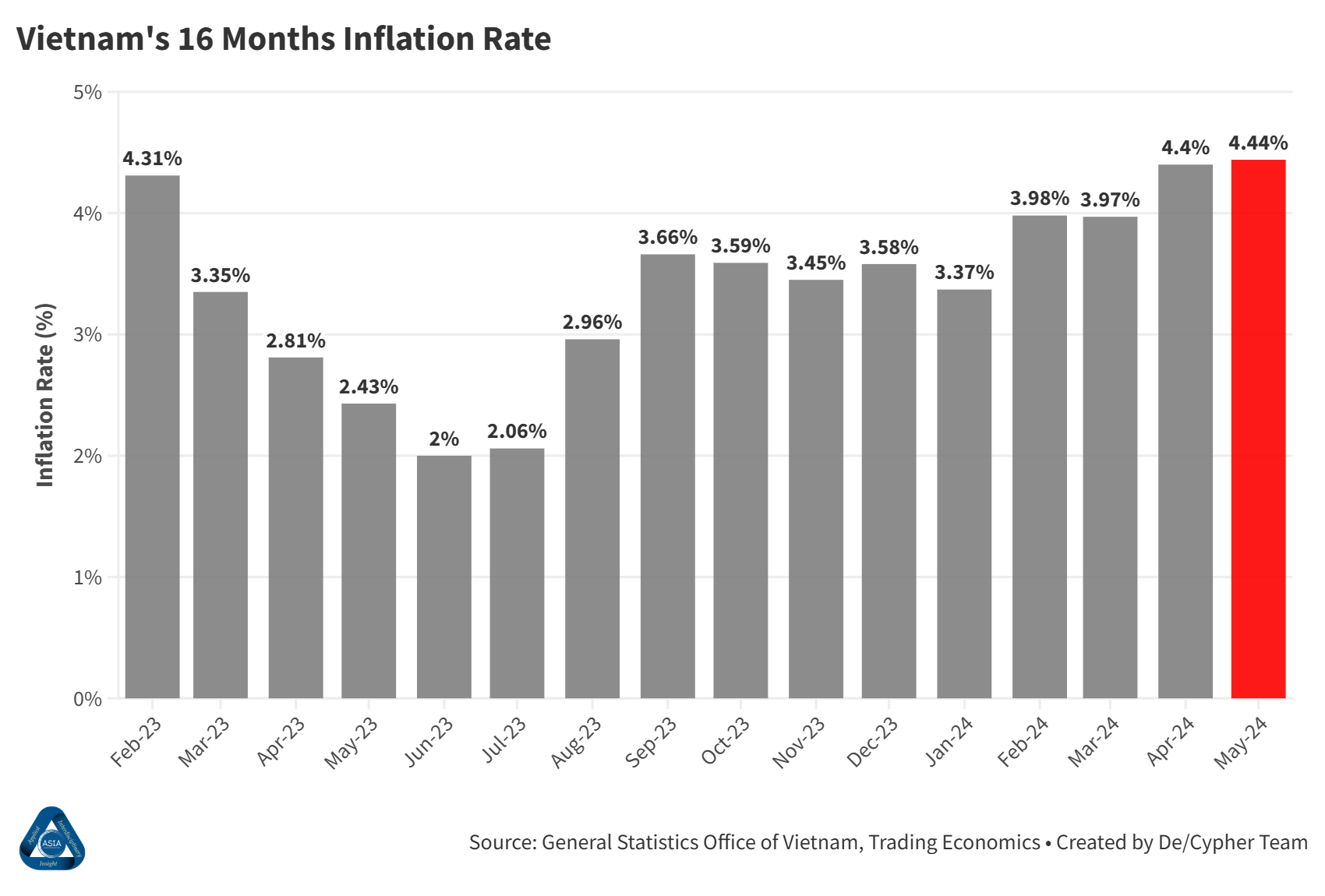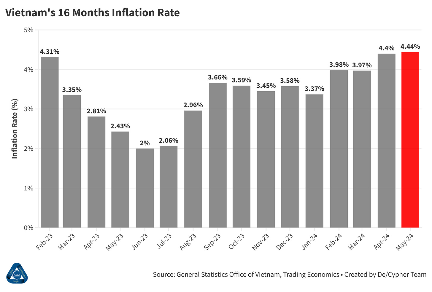 Vietnam’s inflation rate rose to 4.44% in May, the highest in 16 months, driven by increased pork and electricity prices. Read more: Bloomberg