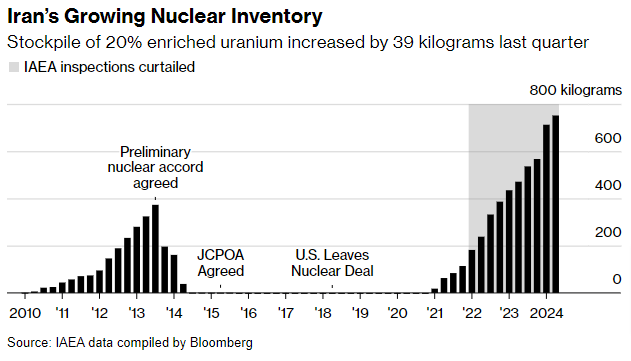 Despite political turmoil, Iran's nuclear program persists, as IAEA data reveals a 39-kilogram increase in 20% enriched uranium over the past quarter. The country's growing capacity to fuel warheads deepens international anxiety about its nuclear aims. Amidst mounting pressure to resolve long-standing nuclear uncertainties, the international community awaits the IAEA's June 3 board meeting where the US and European nations will confront Iran's rising inventory and lack of cooperation. Read more: Bloomberg