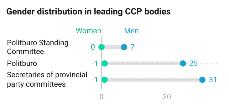 The progress of women in business in China is commendable. However, there is a noticeable lack of female leaders in government, which has been a setback for women's representation. Despite the Communist Party's efforts to increase female participation, the proportion of women party members only reached 29% in 2021 compared to 24% in 2012. In terms of senior positions within the central committee, women currently hold just 8% out of a total of 371 positions, down from 10% in 2007. Additionally, out of China's 31 provincial-level governors, only two are women. Even within the Politburo with its current count of 25 members, only one woman is present, and she is expected to retire soon.