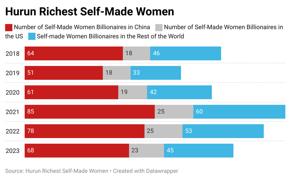 In 2023, the list of self-made women billionaires continues to be dominated by Chinese women, which has been a consistent trend on the list for quite some time. This trend cannot be ignored in a society with a gender ratio skewed at 104.6 males for every 100 females.