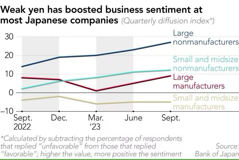 Data from the BOJ's quarterly Tankan survey, which measures enterprises' attitudes in Japan, shows sentiment at Japan's largest companies at historic highs. Japan's carmaking giants, such as Toyota and Nissan, are among the big companies profiting from the weak yen, according to analysts.
