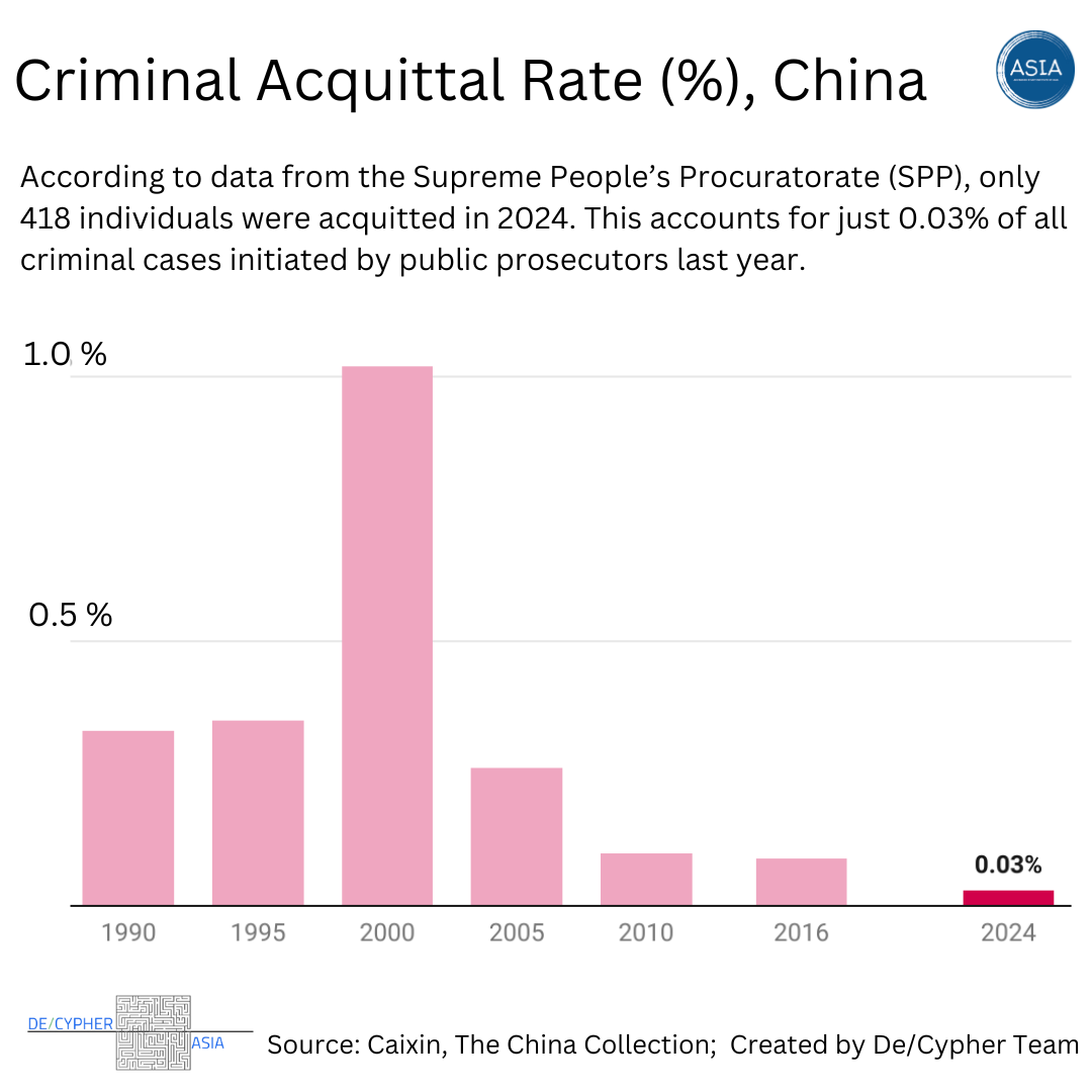 China’s criminal acquittal rate remains exceptionally low. In 2024, only 418 individuals were acquitted or found not criminally liable in public prosecution cases, accounting for 0.03% of all criminal cases.