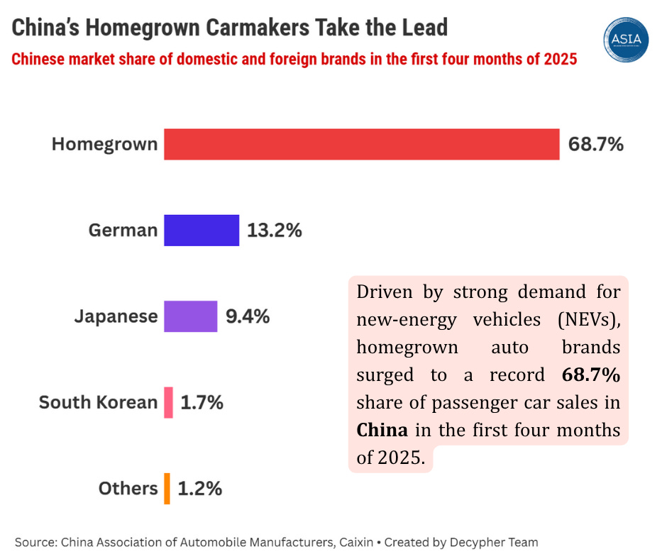 Foreign carmakers, once dominant in China, are now struggling to keep up after failing to adapt quickly to the country’s fast shift toward electric vehicles (NEVs). In contrast, Chinese automakers have soared, accounting for a record 68.7% of passenger car sales in early 2025, up from 38.4% in 2020. To recoup ground, multinational companies are collaborating with local firms and supply chains to compete more effectively in the world's largest auto market.