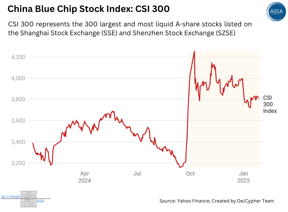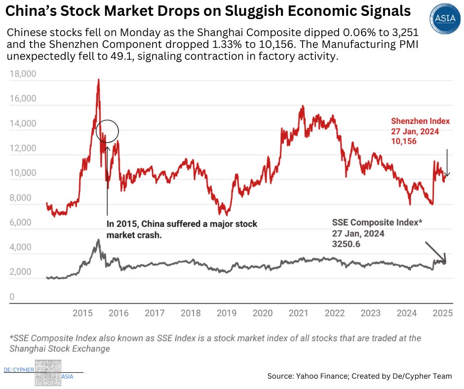 The 2015–16 stock market selloff (The Great Fall of China) saw a dramatic drop in the SSE Composite Index, spurred by fears of a slowing economy and yuan devaluation. January 2025, China's stock market faced another significant downturn, with the CSI 300 Index hitting its lowest point since September 2024.