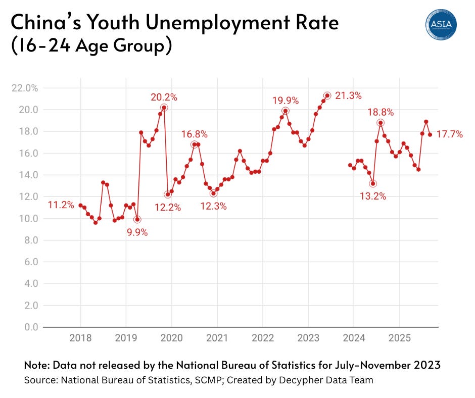 China’s urban youth unemployment rate eased slightly in September but remained worryingly high, reflecting persistent difficulties for young people navigating a tough and saturated job market. The jobless rate among 16- to 24-year-olds, excluding students, fell to 17.7% in September, down from 18.9% in August, according to data released by the National Bureau of Statistics.