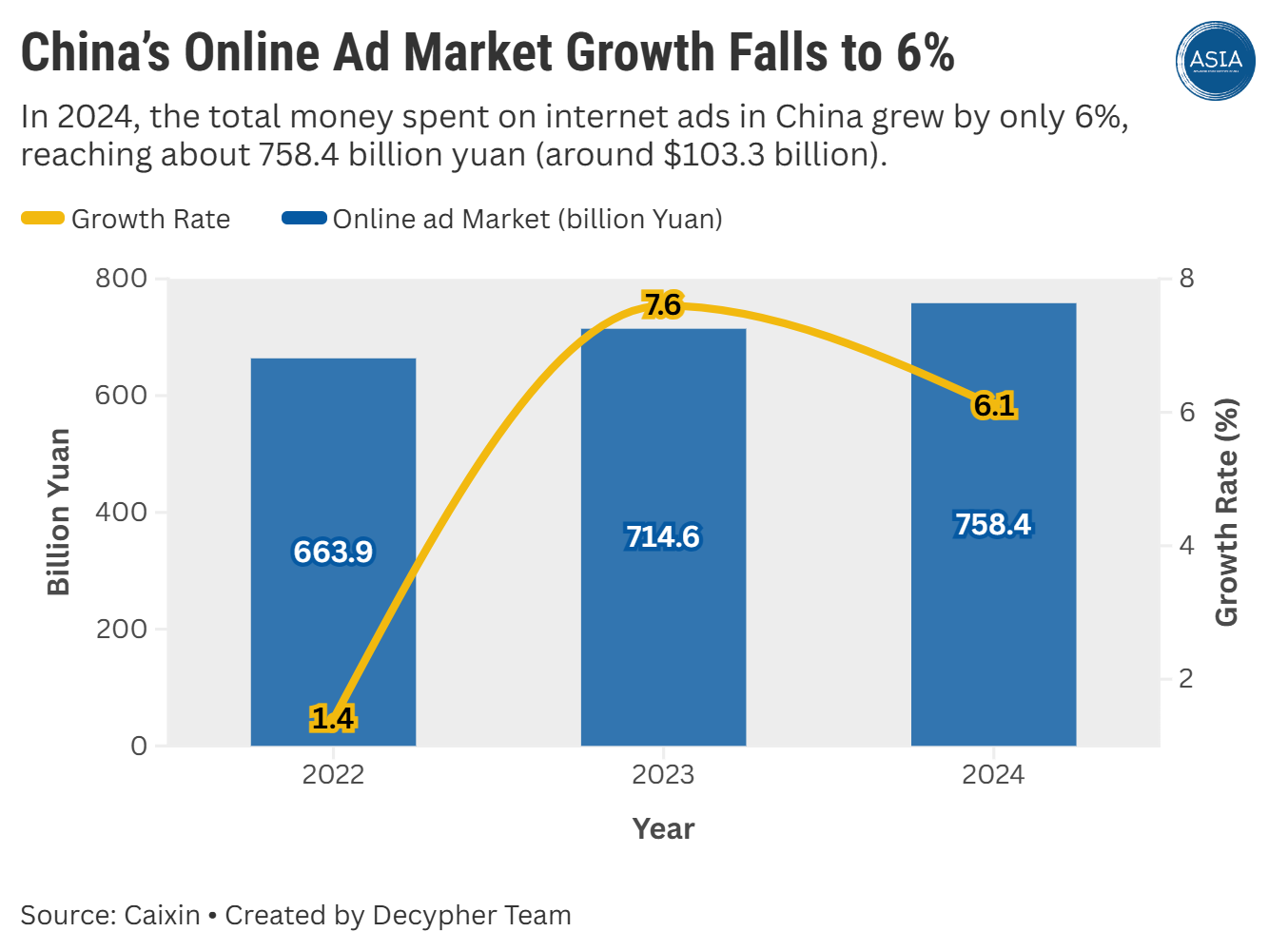 China's advertising market especially online ads isn't growing as fast as it used to. In 2024, the total money spent on internet ads in China grew by only 6%, reaching about 758.4 billion yuan (around $103.3 billion). Businesses are adopting a more cautious approach to advertising, prioritizing campaigns that deliver immediate sales returns over long-term brand building.