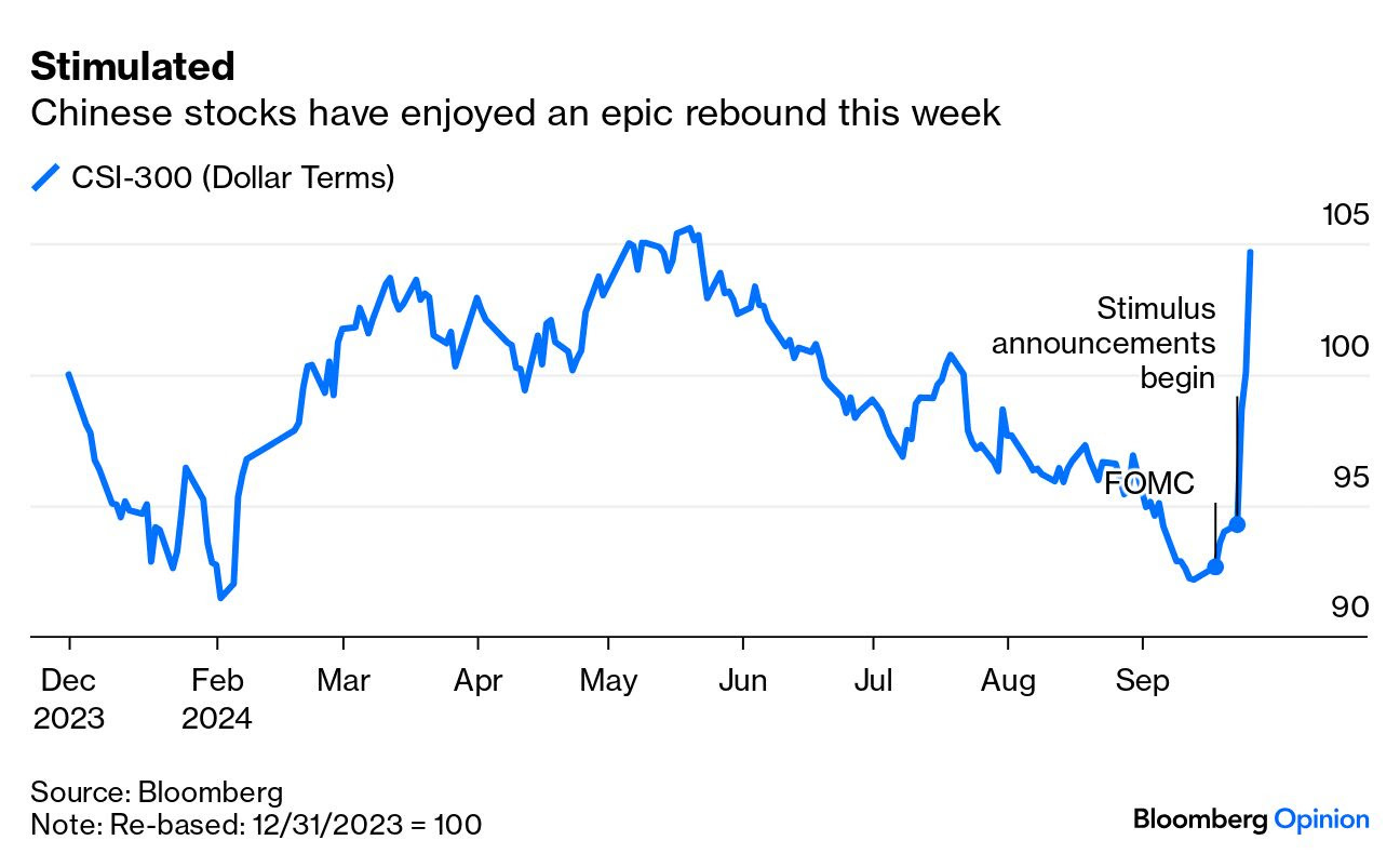 Suddenly, a lot of people are placing a lot of trust in the Communist Party of China. On Thursday, the Politburo, headed by President Xi Jinping, held an unscheduled meeting and then made an announcement that effectively amplified the monetary policy stimulus announced by the central bank earlier this week. On markets, at least, the leadership’s intervention had a big impact, and it got bigger the closer you were to China. The CSI-300, an index of the biggest mainland A-shares traded in Shanghai and Shenzhen, has rallied by more than 10% this week, and it’s nearly back to its high for the year. (Bloomberg)