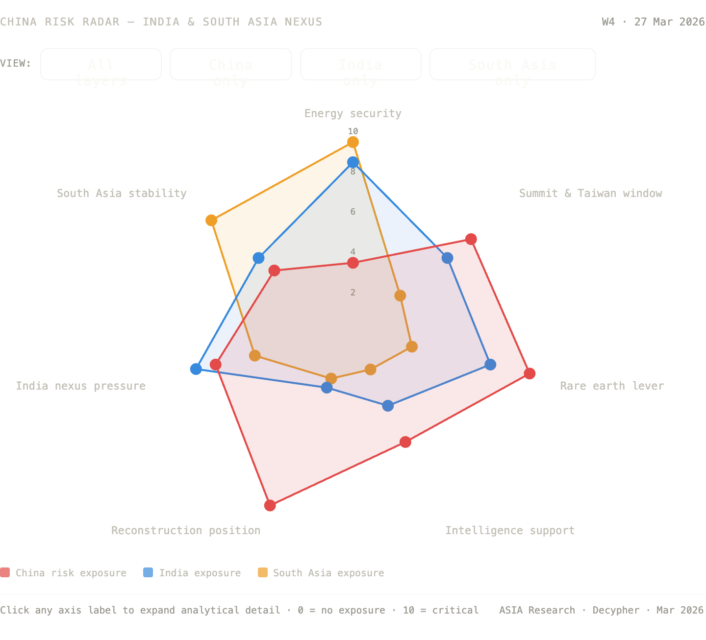 The radar map we built this week tracks seven risk layers for China in the Iran war — energy security, summit and Taiwan, rare earths, intelligence support, reconstruction positioning, India nexus pressure, and South Asia stability — scored against equivalent exposure for India and South Asia. Reading the three polygons together produces a single, uncomfortable finding: China’s risk profile in this crisis is almost the inverse of what most South Asian analysis has assumed.