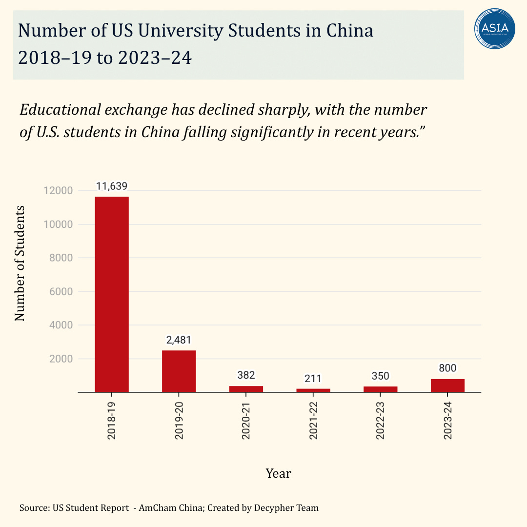 A major concern is the sharp decline in educational exchange. Fewer than 2,000 Americans are currently studying in China, down from over 11,000 in 2019. The United States is not only producing fewer China experts but also losing existing talent, as a growing number of US-based Chinese scientists shift their affiliations to China. Although new initiatives aim to revive engagement—such as the plan announced after the 2023 Biden–Xi summit to bring 50,000 young Americans to China over five years—these efforts have largely taken the form of short-term visits that do little to rebuild deep, long-term expertise. Experts warn that future policymakers may lack the on-the-ground understanding needed to manage an increasingly complex bilateral relationship.