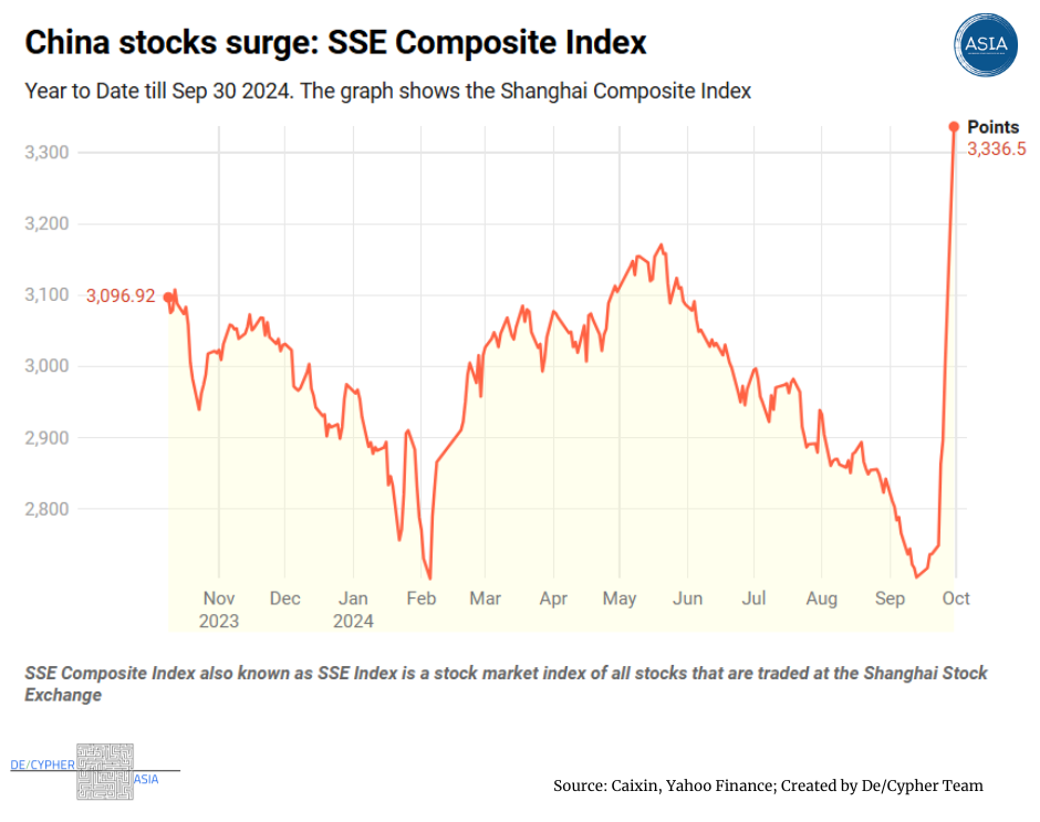 Chinese government announced a series of measures aimed at stimulating the economy. Indices of major stock markets in the country have seen their values soar. The CSI 300 Index, which tracks the top 300 stocks on the Shanghai and Shenzhen exchanges climbed more than 15% last week, the biggest weekly gain since 2008. (Caixin)