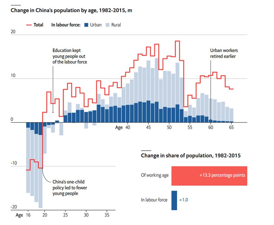 An analysis by Dr. Xin Meng of the Australian National University in her new working paper “China's 40 Years Demographic Dividend and Labor Supply: The Quantity Myth” throws new light on the existence of demographic dividend in China. Her analysis shows that between 1982 and 2015 China’s working-age population, grew from 600m to 1 billion. As a share of the total population of China, it rose from 60% to 73%. But during the same period, labor-force participation dropped from 85% to just over 70%. Much of the decline was caused by mandatory retirement at the age of 55 for women and 65 for men and compulsory education with high university enrolment which kept people under 25 years out of the workforce. Participation for women of childbearing age in workforce also fell, probably because of the increasing cost of childcare. As a result, from 1982 to 2015 China’s labor force as a share of the total population was around 50%. Based on this, Dr Meng argues that the demographic dividend may never have existed in China. The rapid economic growth that China experienced in past 40 years may have been the result of a high-quality workforce than a high quantity of workforce. If this is true, then the current decline in China’s population might not affect its economy. For More details: The Economist.