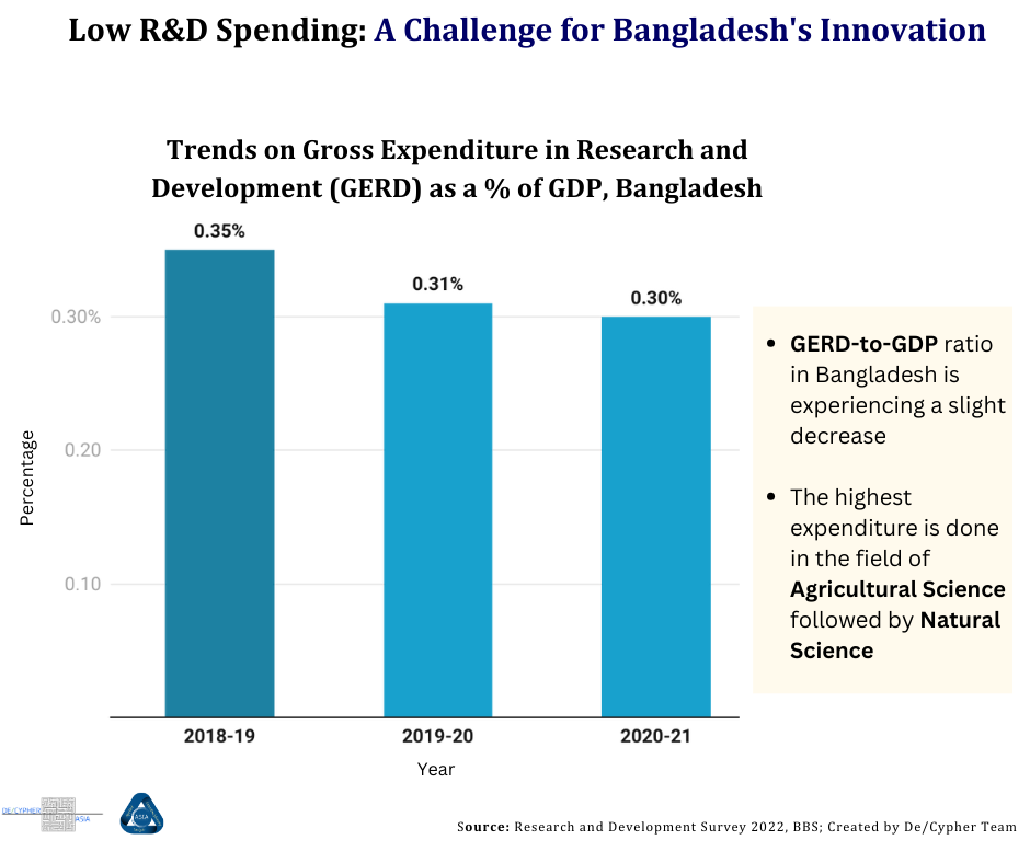 According to the Research and Development (R&D) Survey 2022, Bangladesh Bureau of Statistics, Bangladesh is experiencing a decrease in Gross Expenditure on Research and Development (GERD) as a percentage of GDP.