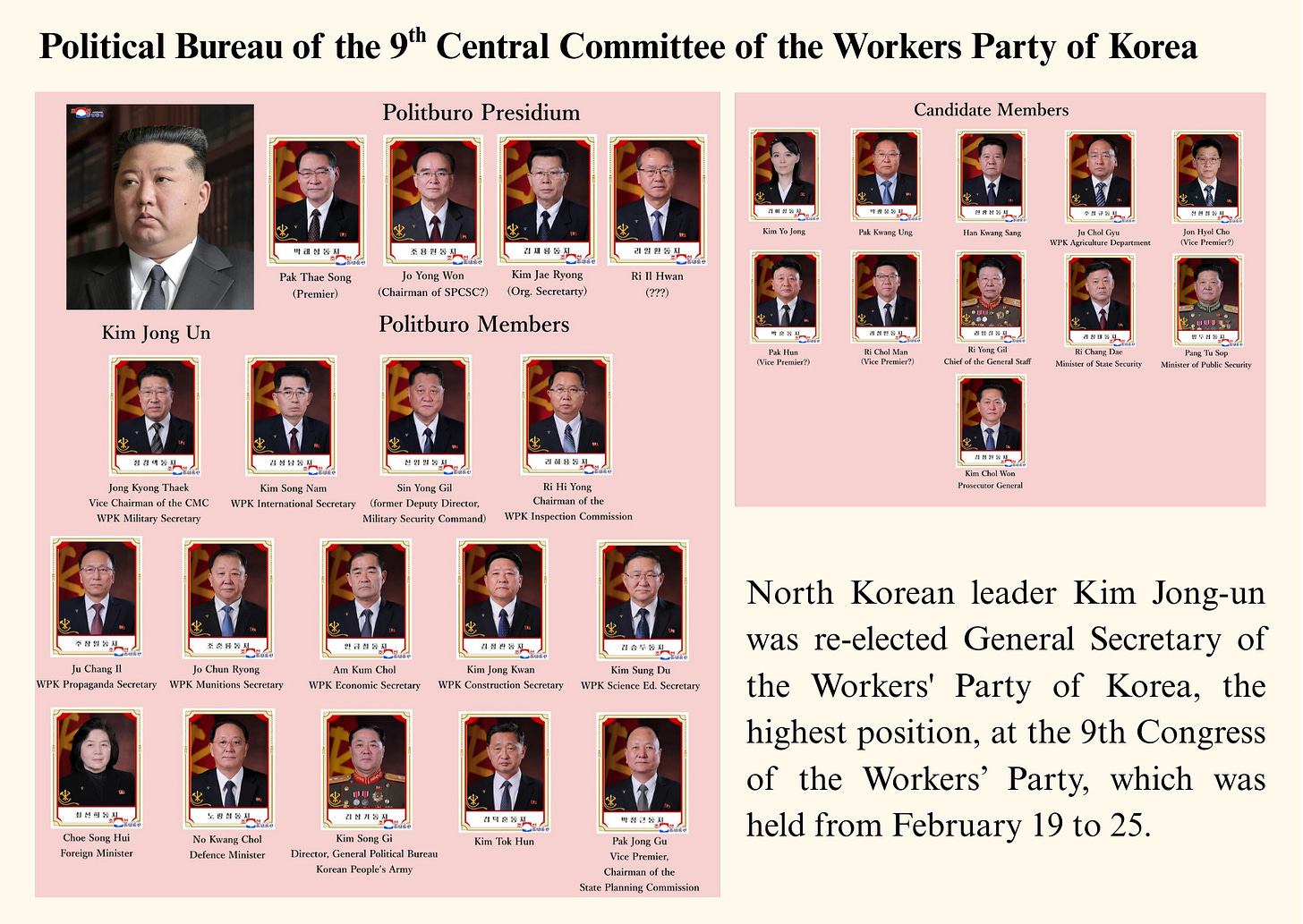 His re-election was accompanied by a significant leadership reshuffle. More than half of the Central Committee and alternate members were replaced, signaling a generational shift. Key inter-Korean relations officials Kim Yong-chol and Ri Son-gwon, along with senior figure Choe Ryong-hae, were excluded from the new lineup. While only 47.5% of Central Committee members retained their posts, a large majority of alternate members were newly appointed, indicating consolidation around younger loyalists.