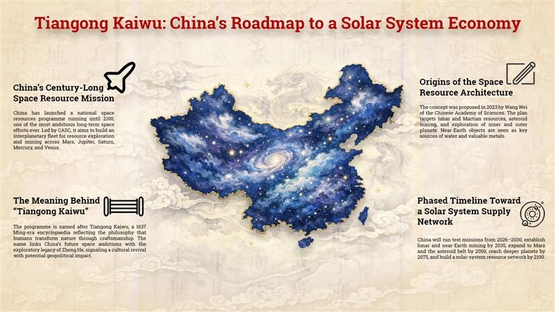 The programme is named after Tiangong Kaiwu (“The Exploitation of the Works of Nature”), a major encyclopaedic work published in 1637 during the Ming dynasty. The name reflects the Ming scientific philosophy that “materials are born of nature; humans transform them through craftsmanship.” It also symbolically connects China’s future space ambitions to the historic voyages of Admiral Zheng He, extending the idea of exploration from the seas to the entire solar system. This growing interest in reviving Ming dynasty-inspired thinking reflects a broader cultural shift that may have far-reaching implications for the future geopolitical landscape.