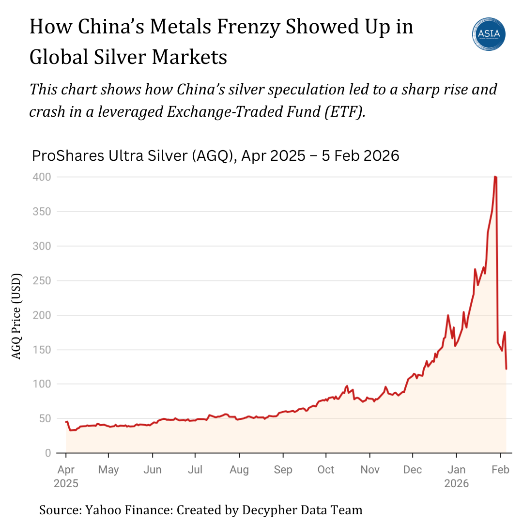 Global price movement was swiftly impacted by this spike in trading activity in Shanghai futures markets. The fast increase and then decline in ProShares Ultra Silver (AGQ), a 2× leveraged silver ETF traded in the US, as international investors responded to swift price swings, was one obvious manifestation of this volatility.