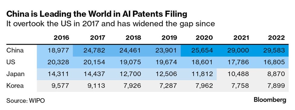 China has significantly expanded its lead over the United States in the race for AI patents, showcasing the country's commitment to shaping the future of this transformative technology. In 2022, Chinese institutions filed for 29,853 AI-related patents, marking an 80% increase from the previous year and surpassing the US by a significant margin. China now accounts for more than 40% of global AI patent applications. This trend reflects Beijing's efforts to gain a competitive edge in various tech sectors, including chipmaking, space exploration, and military sciences. Chinese President Xi Jinping's call for increased fundamental research has led to substantial investments in AI and quantum computing. Key players like Baidu, Alibaba, and Tencent are actively working to develop AI technologies, emphasizing China's leadership in AI innovation. The country has maintained this trajectory since surpassing the US in AI patent filings back in 2017.