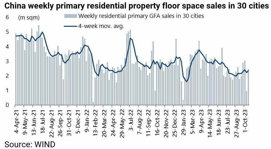 On this point, weekly primary residential floor space sales in the major 30 cities averaged 2.345m sqm in the four weeks ended 15 October, up 9% from the previous four weeks and were 18% above the recent low of 1.988m sqm in the four weeks to 27 August prior to the announcement, though they are still down 21% YoY."