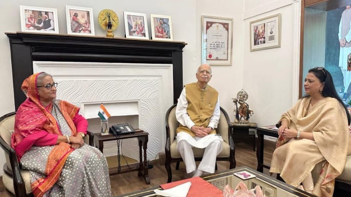 During her official visit to India, Prime Minister Sheikh Hasina paid a courtesy call to veteran BJP leader LK Advani at his residence in New Delhi. The meeting was brief, with three photos released by an Indian media outlet, providing no further details. LK Advani, a Bharat Ratna awardee, had a significant political career, serving as the president of the Bharatiya Janata Party and holding key positions like Home Minister and Deputy Prime Minister under Atal Bihari Vajpayee's leadership. Prime Minister Hasina's visit aims to strengthen the close and deep-rooted bonds of friendship between Bangladesh and India. Read more: The Daily Star