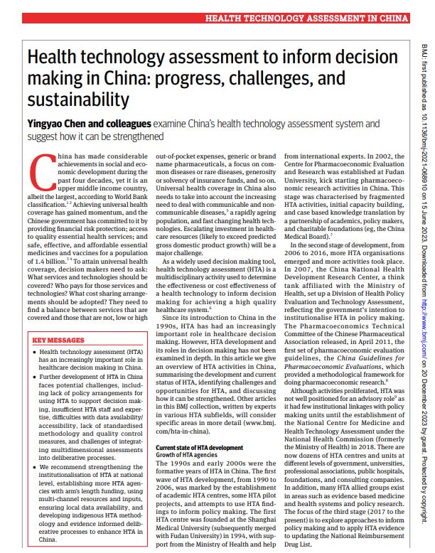 The paper titled “Health technology assessment to inform decision making in China: progress, challenges, and sustainability” gives an overview of health technology assessment (HTA) development, problems, and sustainability in China.