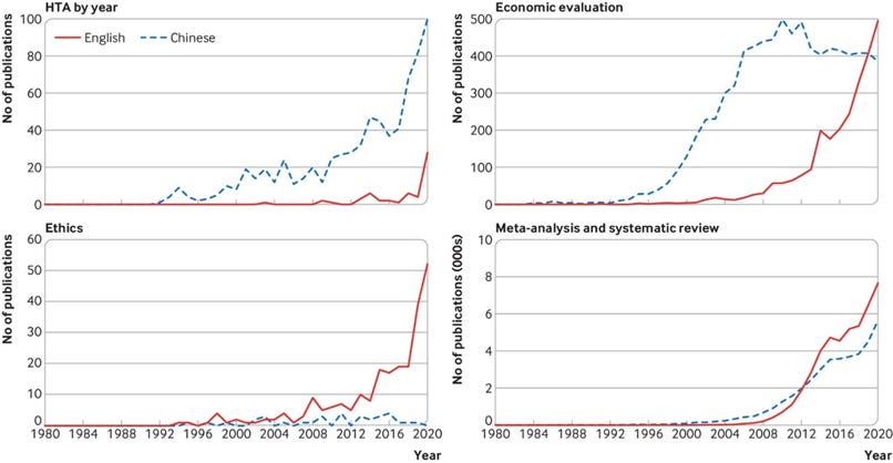 China has seen an increase in Health Technology Assessment (HTA)-related publications over the past 40 years, indicating growing research interest and activity in the field. A total of 96,279 articles by Chinese researchers published in English and Chinese between January 1, 1980, and December 31, 2020, were found using search terms such as economic evaluation, HTA focused ethics research, and meta-analysis. These publications serve as a proxy indicator for gauging the development of HTA in China.
