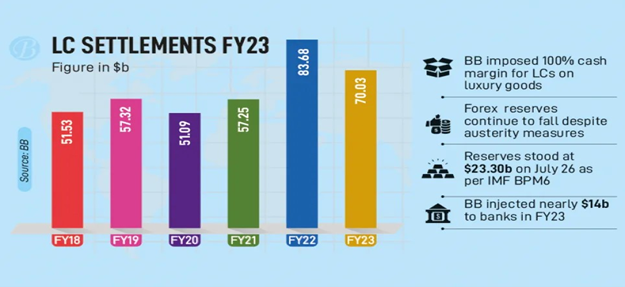 LC settlements in Bangladesh fell by 16% in FY23 due to austerity measures implemented by the government and Bangladesh Bank to save forex reserves. (Mehedi Hasan, The Business Post)
