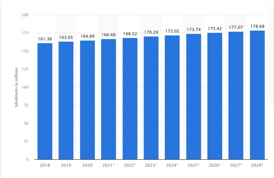 Bangladesh's total population is expected to grow by 8.4 million (+4.93 percent) between 2023 and 2028. According to this forecast, the total population will have increased for the fifth year in a row to 178.68 million people in 2028. Notably, the total population has been steadily increasing in recent years. (Aaron O’neil, Statista)